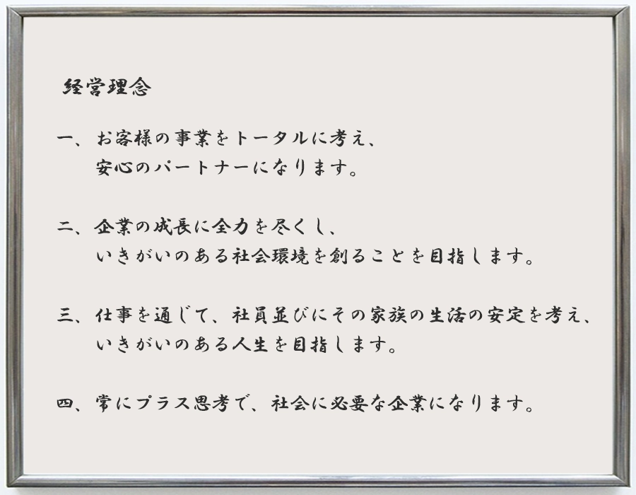 三. 仕事を通じて、社員並びにその家族の生活の安定を考え、いきがいのある人生を目指します。